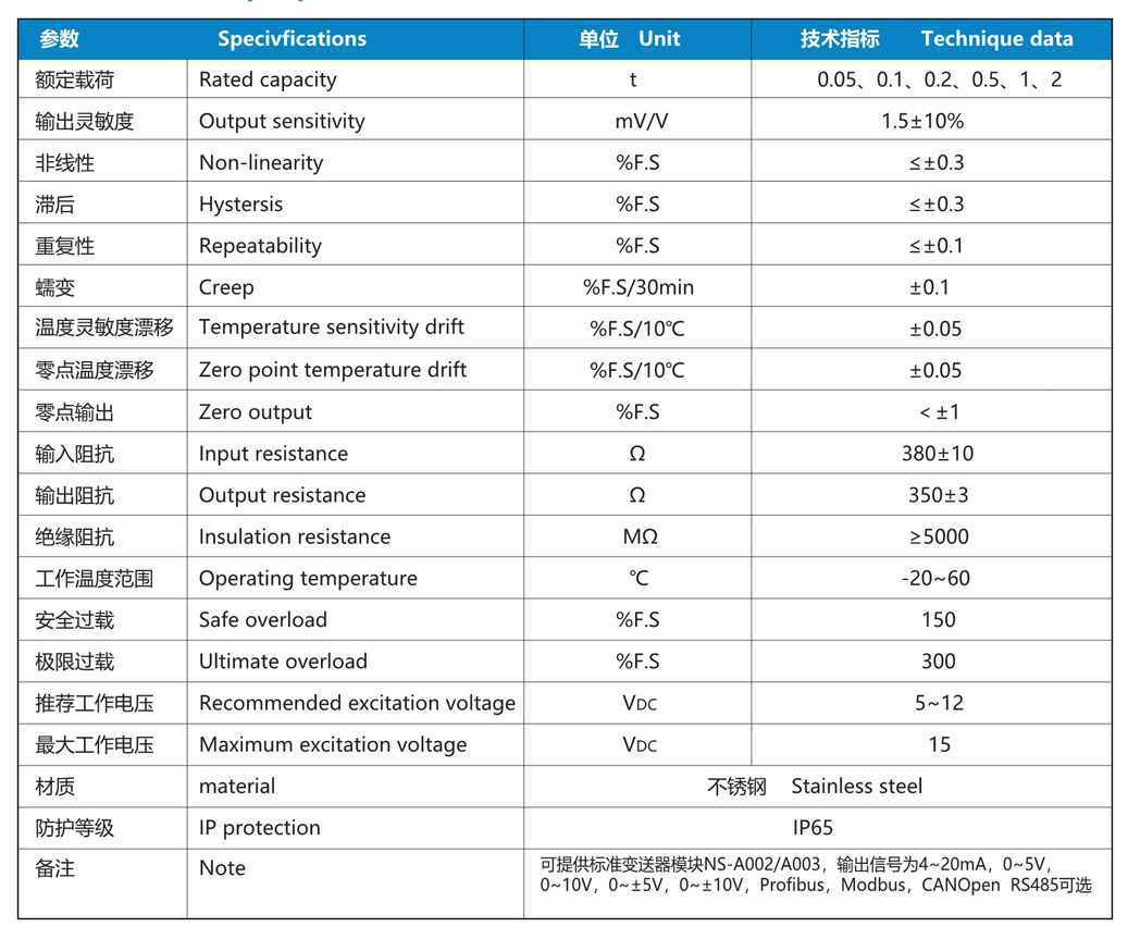 输出:1mv/V、0~±5/10V、4~20mA可选